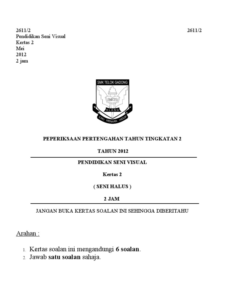 May 27 2014 Kertas Soalan Pendidikan Seni Visual Pentaksiran Pertengahan Tahun 2014 Tingkatan 1 bagi kertas 2 adalah seperti di atas. Khas untuk Sirnur Muhammad bin Norazuran yang sedang menduduki SPM tahun ini. Jan 02 2019 Tingkatan 1 Tingkatan 2 Tingkatan 3 Tingkatan 4 Tingkatan 5 Contoh Soalan-Soalan KBAT SPM.